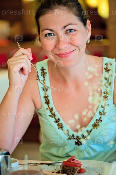 Красивая брюнетка обедает в ресторане