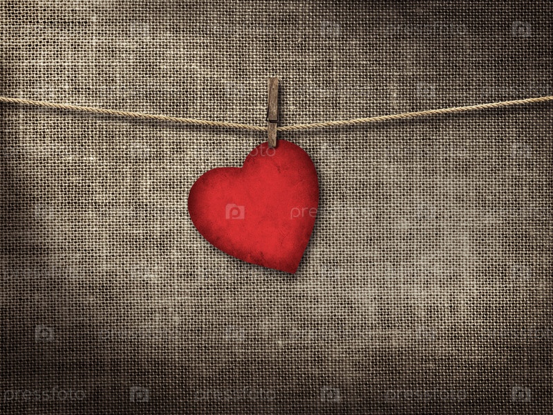 Валентинка с форме сердца висит на веревке на льняном фоне