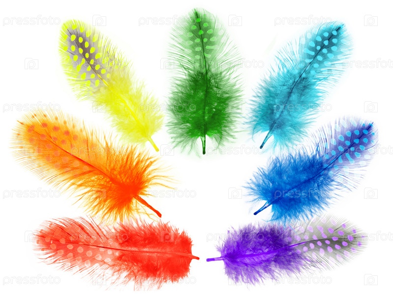 Окрашенные в цвета радуги перья цесарки на белом фоне