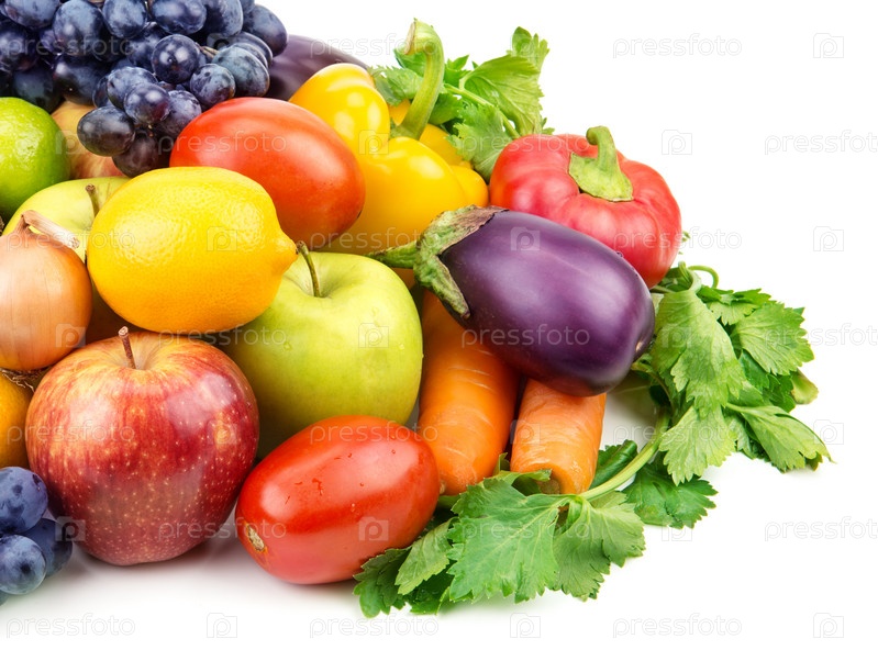 Набор различных фруктов и овощей, изолированных на белом фоне