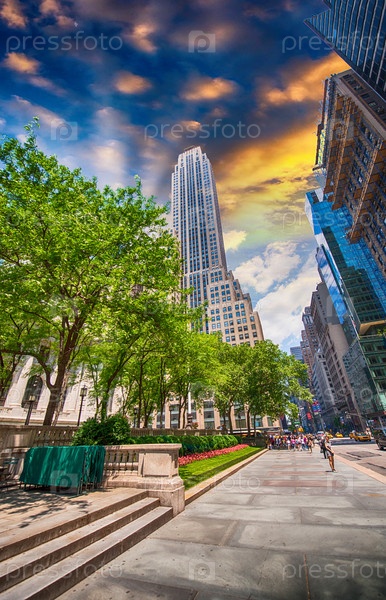 Небоскребы в Нью-Йорке на Пятой авеню, рядом с публичной библиотекой. Прекрасный вид улицы Манхэттена на закате
