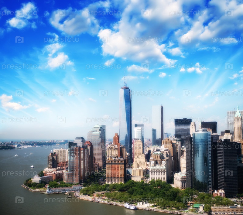 Красивый вид Нижнего Манхэттена с воздуха на закате