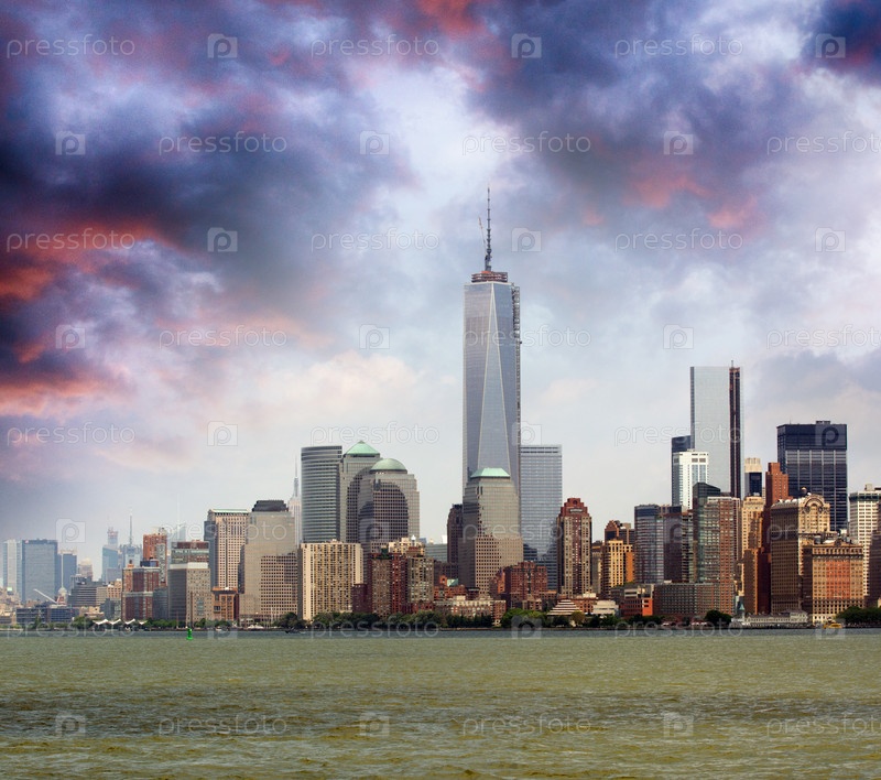 Ист-Ривер и Нижний Манхэттен в сумерках - Нью-Йорк Сити