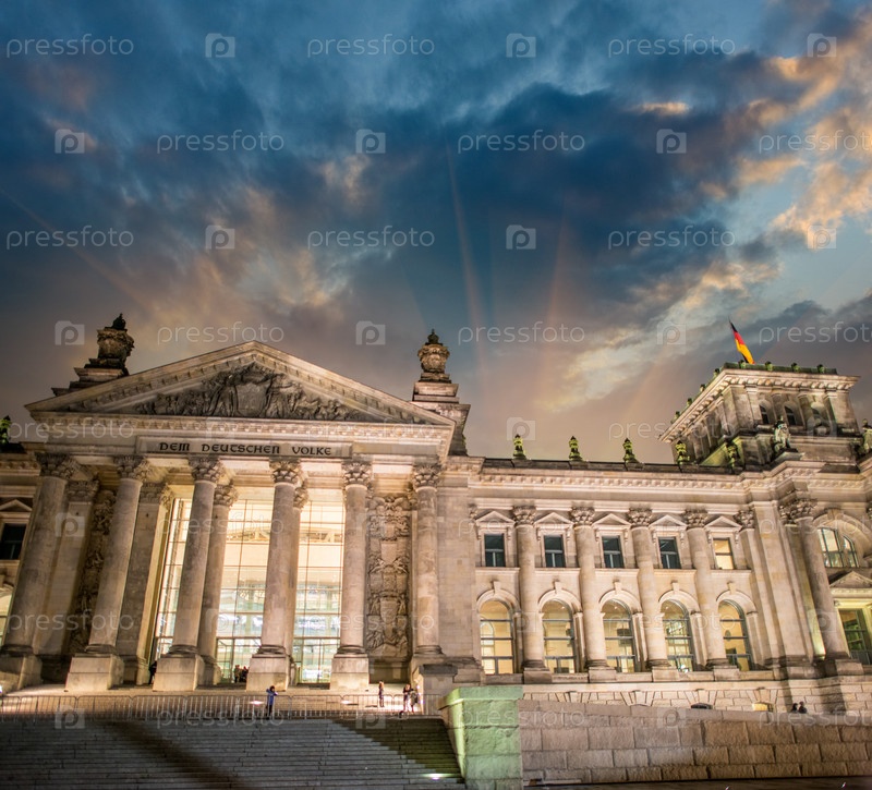 Фасад здания Рейхстага в зимний вечер, Берлин, Германия