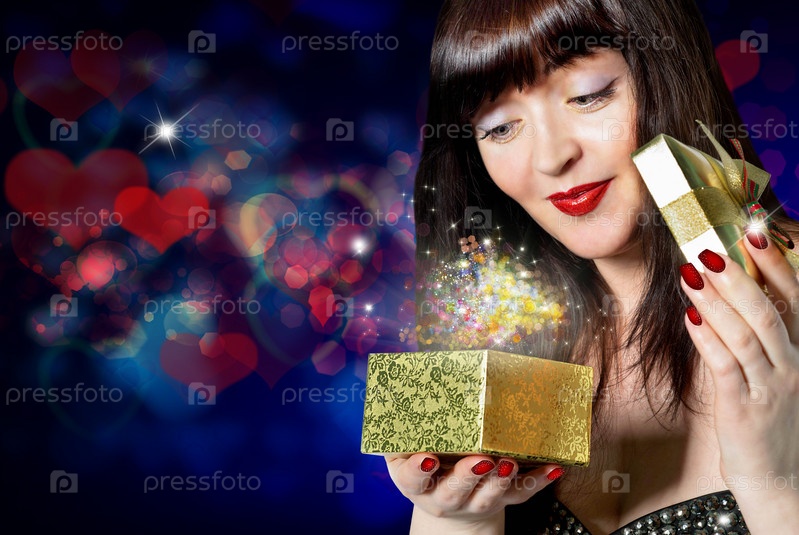 Красивая девушка открывает золотистую коробку с праздничным подарком к Дню Святого Валентина