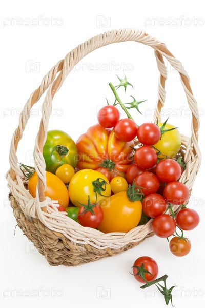 Разноцветные помидоры в корзине на белом фоне