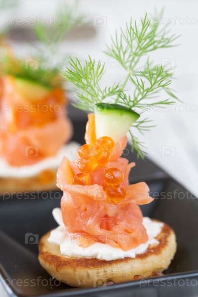 Закуска с копченым лососем, сметаной и укропом крупным планом