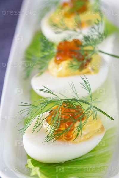 Закуска из яиц, форшированных красной икрой, украшенная укропом, на белом фоне