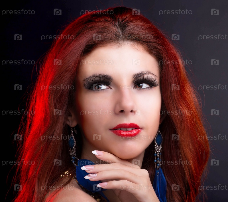 Портрет красивой девушки с рыжими волосами на черном фоне