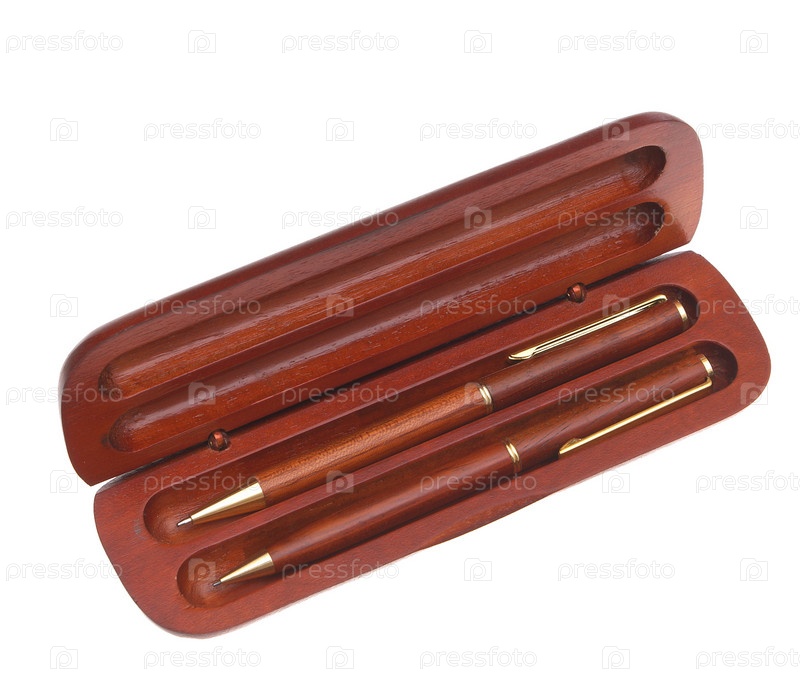 Ручка и карандаш в деревянном чехле на белом фоне