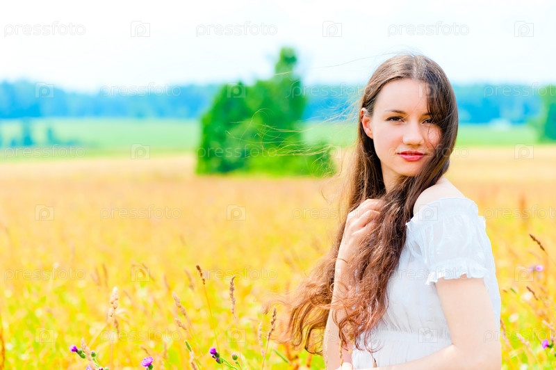Симпатичная девушка отдыхает в поле с цветами