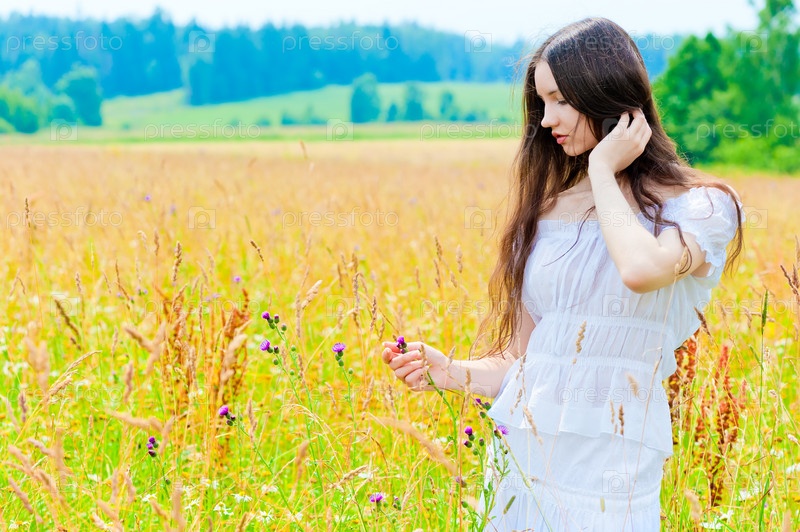 Портрет красивой молодой брюнетки в поле