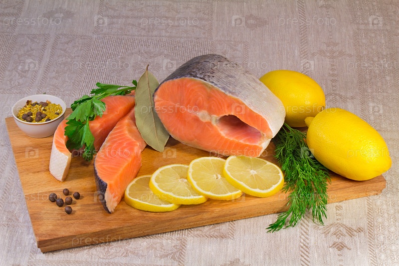 Лосось, лимон и зелень на столе