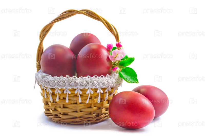Красные пасхальные яйца в корзине на белом фоне
