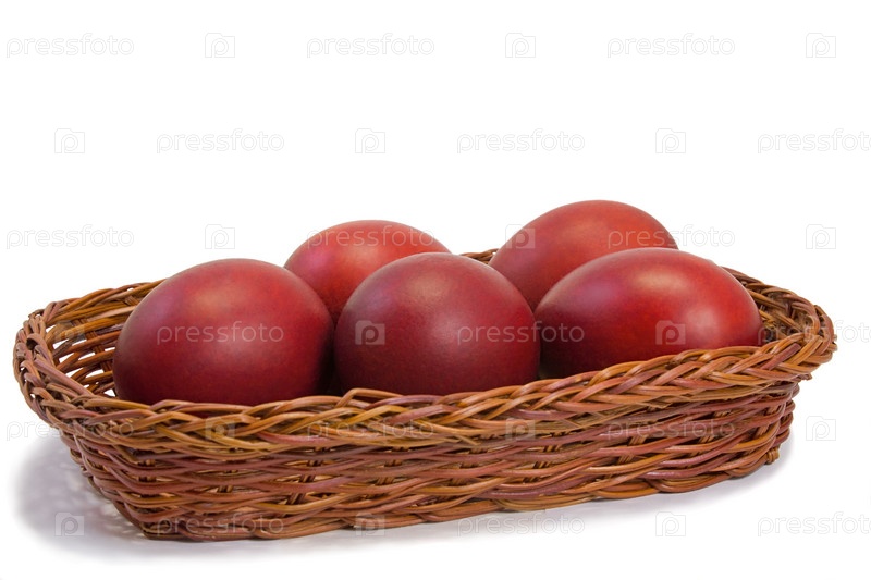 Красные пасхальные яйца в корзине на белом фоне