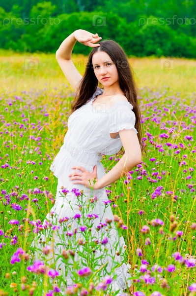 Красивая женщина позирует в поле с цветами