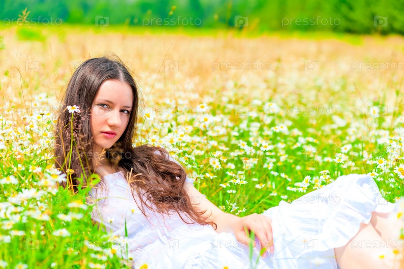Девушка отдыхает на летнем поле с цветами