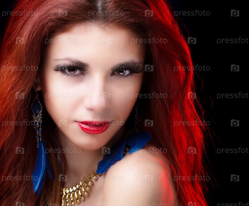 Портрет красивой девушки с рыжими волосами на черном фоне