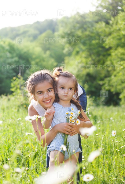 Две счастливые сестры на весеннем в поле