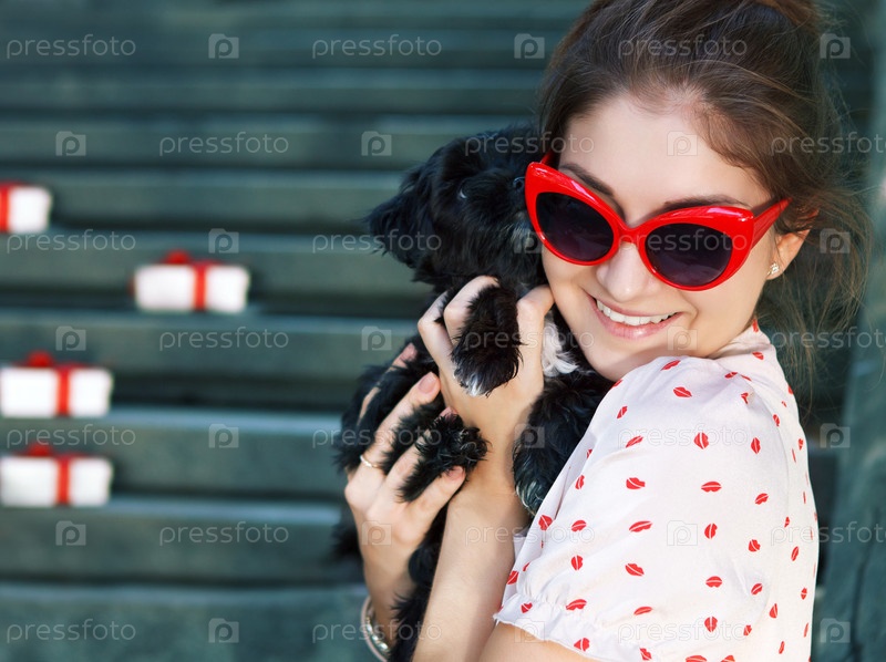 Молодая брюнетка обнимает щенка