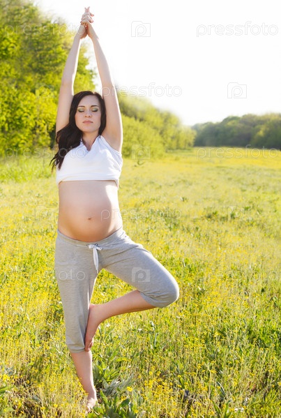 Здоровая беременная женщина занимается йогой в природе