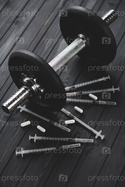 Гантель, шприцы и таблетки на темной деревянной поверхности
