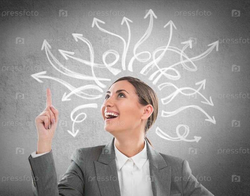 Счастливая деловая женщина со стрелками над головой