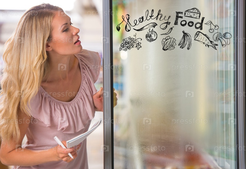 Молодая симпатичная женщина думает о здоровой пище в продуктовом магазине
