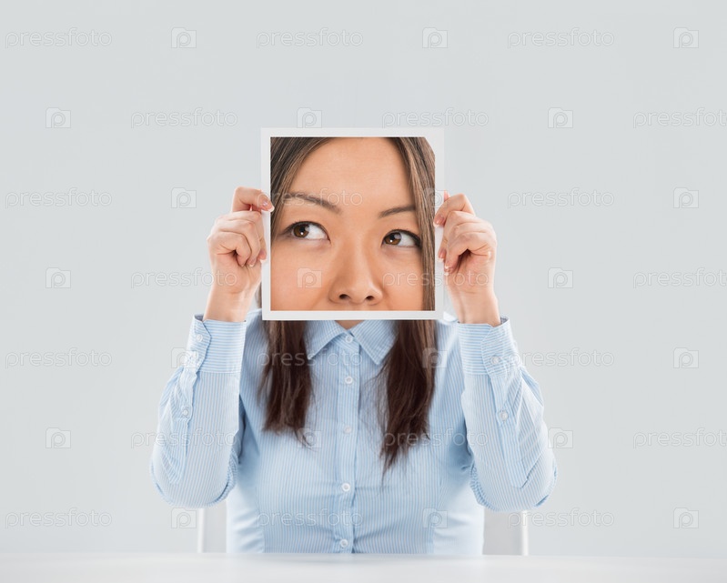 Молодая женщина держит фотографию глаз перед лицом