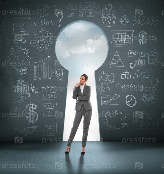 Деловая женщина перед замочной скважиной