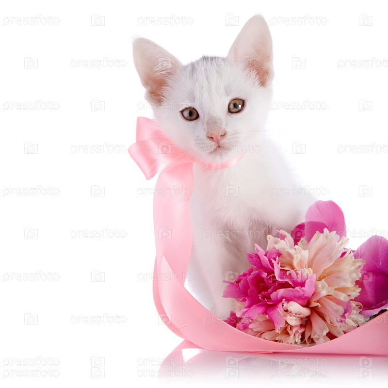 Белый котенок с розовой лентой и цветком пиона