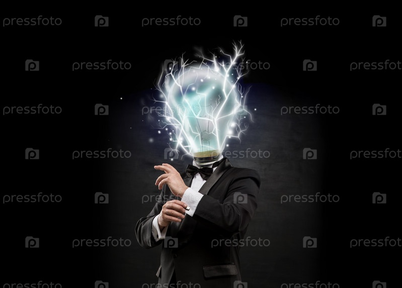Мужчина с лампой вместо головы на черном фоне