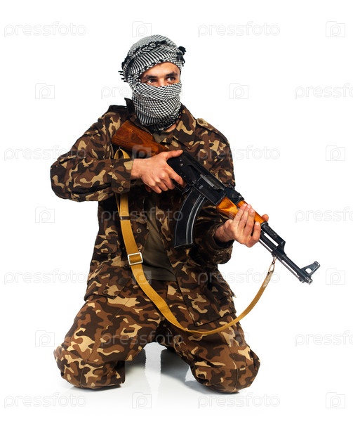 Араб в маскировочном костюме и куфии с автоматом на белом фоне