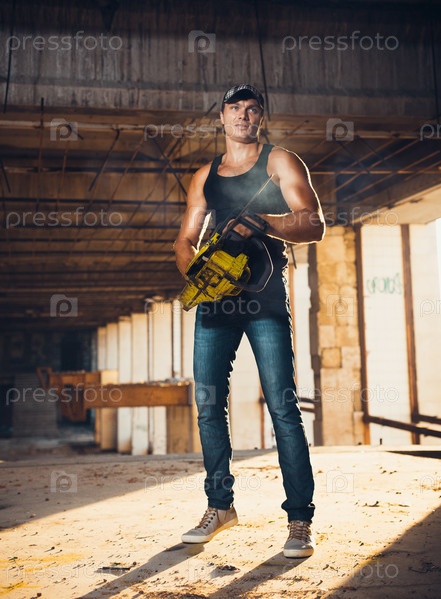 Мускулистый мужчина с бензопилой