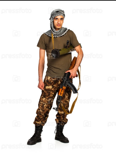 Араб в маскировочном костюме и куфии с автоматом на белом фоне
