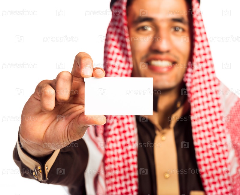 Молодой араб с визиткой в руке, изолированный на белом