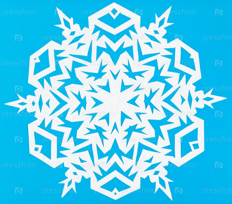Белая снежинка на голубой бумаге