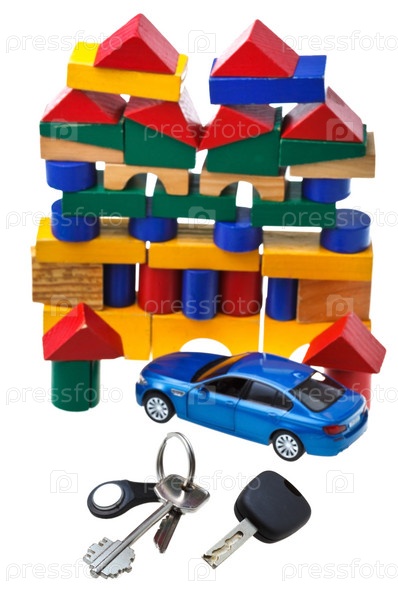 Автомобильные ключи, красный игрушечный автомобиль и дом