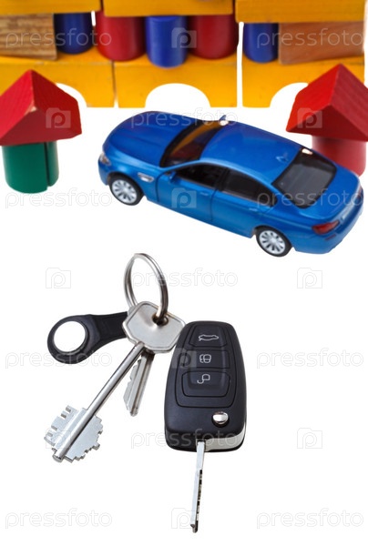 Автомобильные ключи, красный игрушечный автомобиль и дом