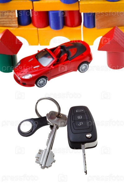 Автомобильные ключи, красный игрушечный автомобиль и дом