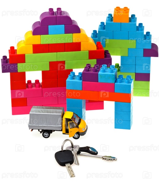 Ключи, модель автомобиля, пластиковый дом из кубиков
