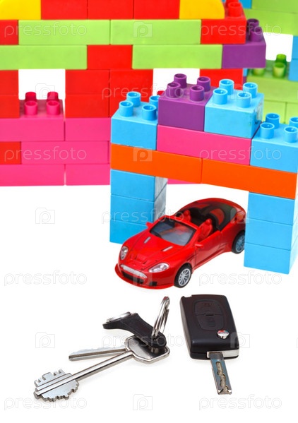 Ключи, модель автомобиля, пластиковый дом из кубиков