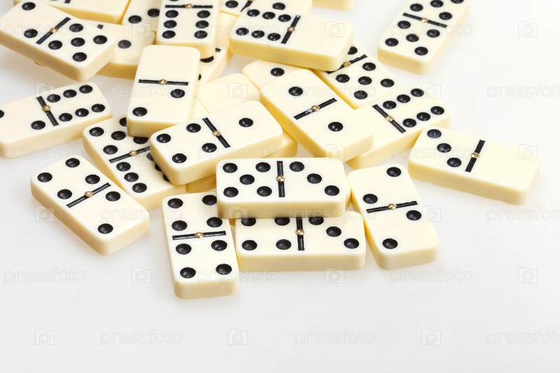 Разбросанные кости домино на белом фоне