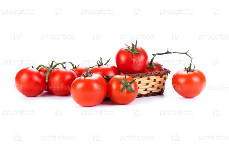 Красные помидоры в корзинке на белом фоне