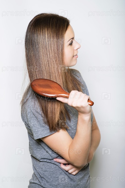 Молодая брюнетка расчесывает длинные волосы