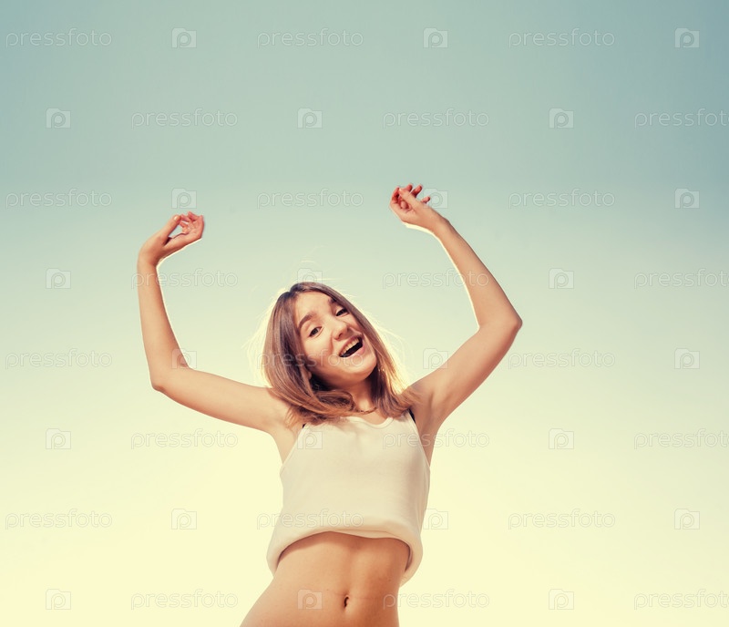 Белокурый подросток прыгает на фоне голубого неба