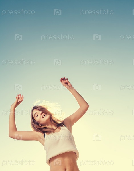 Белокурый подросток прыгает на фоне голубого неба