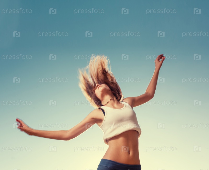Белокурый подросток прыгает на фоне голубого неба