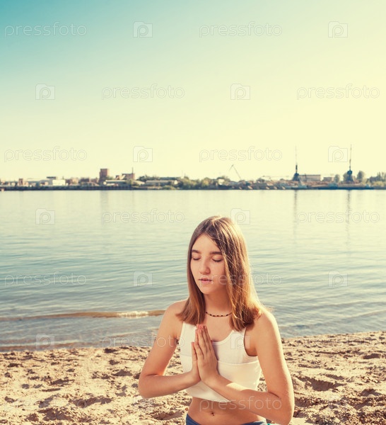 Девушка в позе лотоса на берегу реки