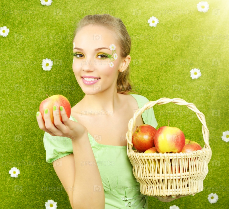 Привлекательная девушка с корзиной яблок
